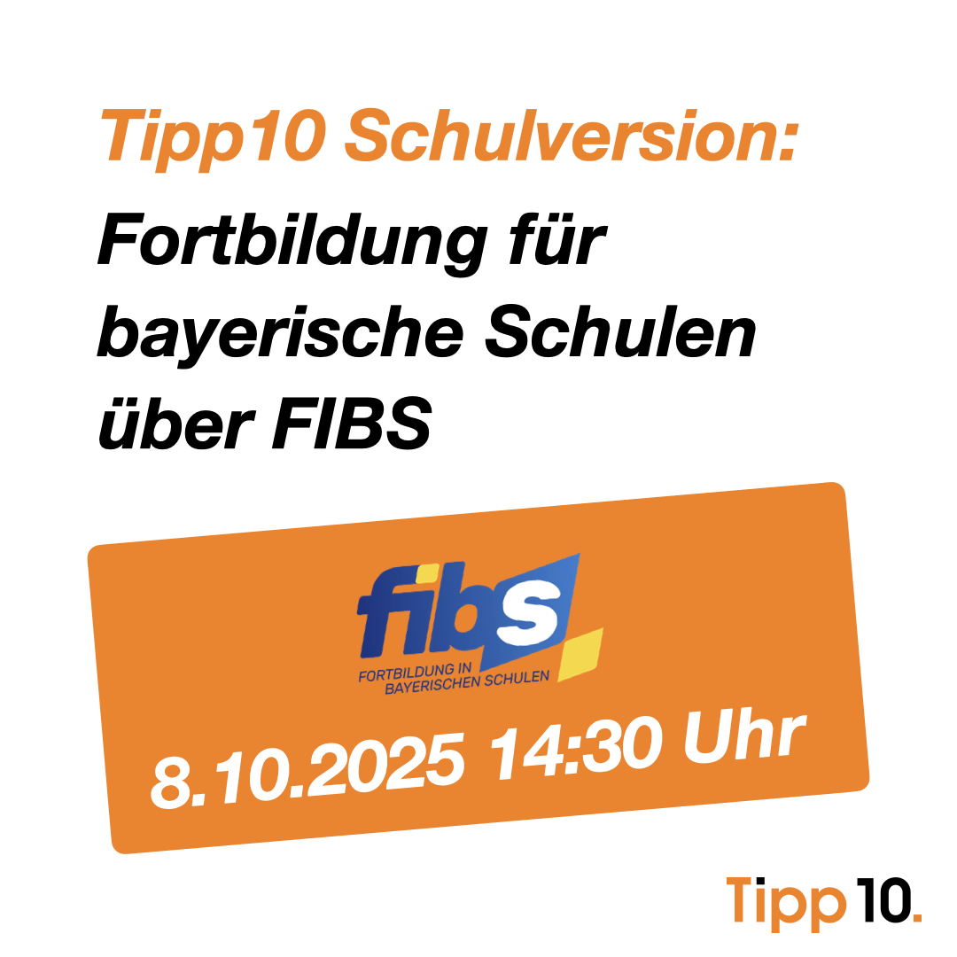 Am 8.10.2025 um 14:30 Uhr bieten wir Lehrpersonen bayerischer Schulen eine kostenlose Fortbildung für die Tipp10 Schulversion über FIBS an.